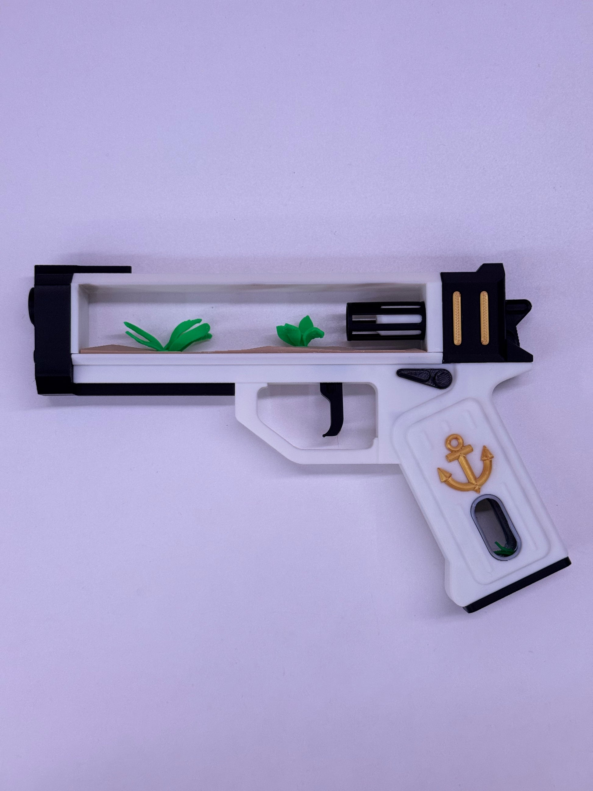 Make waves in your Valorant cosplay with this ocean-themed sidearm prop! Featuring a sleek white-and-black design with gold accents ⚓ and a unique aquarium-style detail 🪴, this piece is perfect for standing out at cons, photoshoots, or on display.